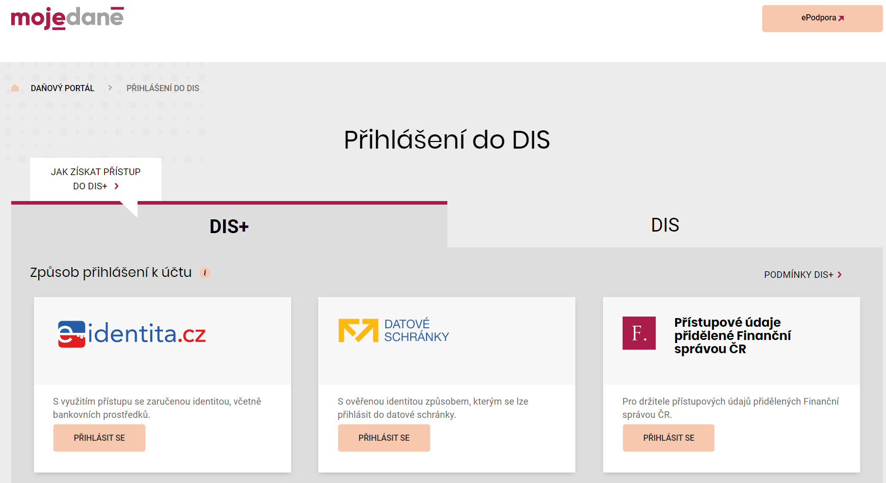 V současné době je ještě možné přihlásit se jak do nové daňové informační schránky (DIS+), tak i do původních schránek označených pouze DIS.