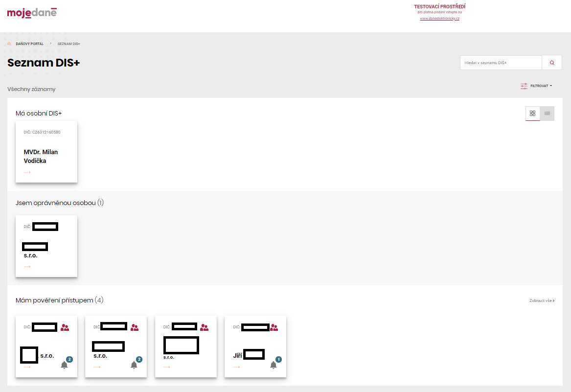 U každé skupiny je v závorce uveden počet dostupných daňových informačních schránek, tlačítkem vpravo lze přepínat pohled mezi dlaždicemi a řádkovým seznamem. Jsou k dispozici i filtry podle počtu uživatelů nebo existence notifikací (upozornění – viz dále) a vyhledávání podle části názvu daňového subjektu.